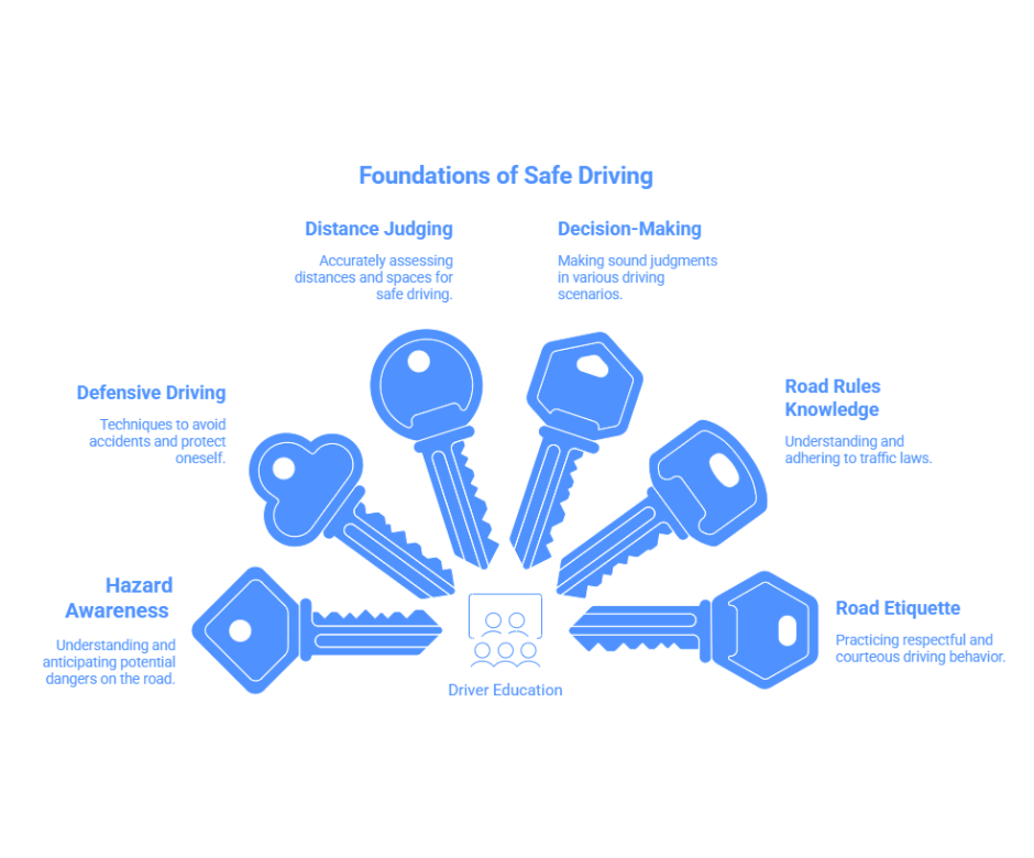 A: Driver education teaches hazard perception, defensive driving, decision-making, and road awareness, all of which are essential for preventing accidents and reducing risks.